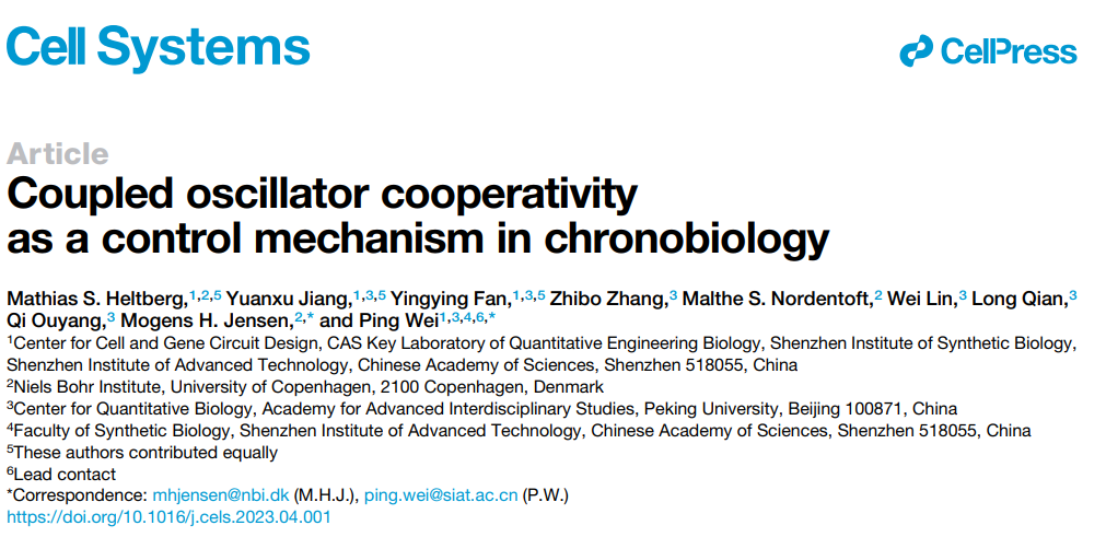 2023年5月17日,中国科学院深圳先进技术研究院合成生物学研究所细胞与基因线路设计中心魏平课题组与丹麦皇家科学院院长Mogens H. Jensen课题组合作在Cell Systems上发表研究论文“Coupled oscillator cooperativity as a control mechanism in chronobiology”,通过合成生物学方法构...