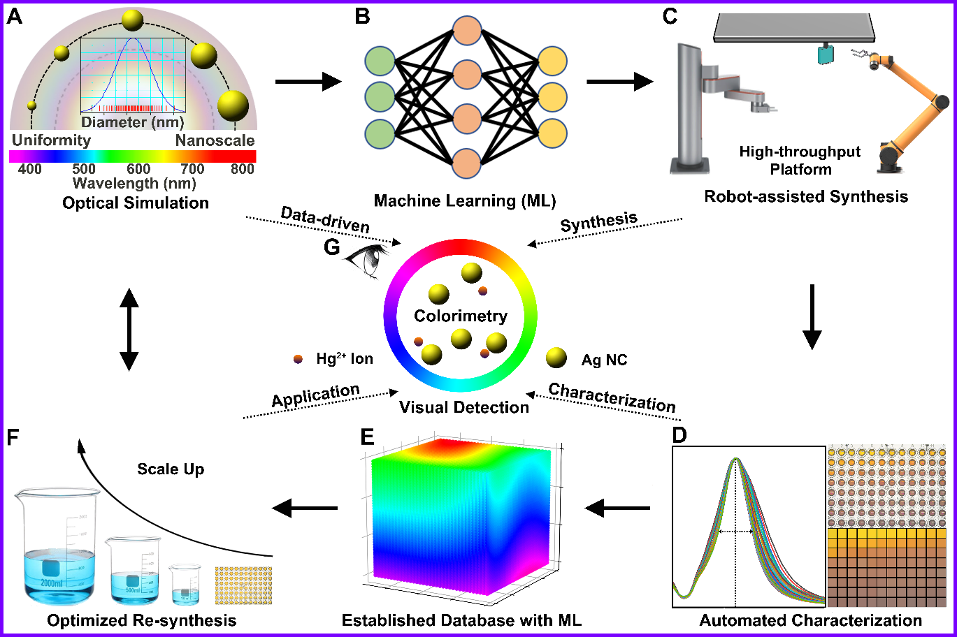 该工作将光学仿真、数据建模、自动化合成、原位表征、机器学习等方式融合实现银纳米晶的高通量及其原位应用研究,加速材料应用在可视化传感检测当中,实现胶体光学材料高通量数据驱动研究的科学新范式。