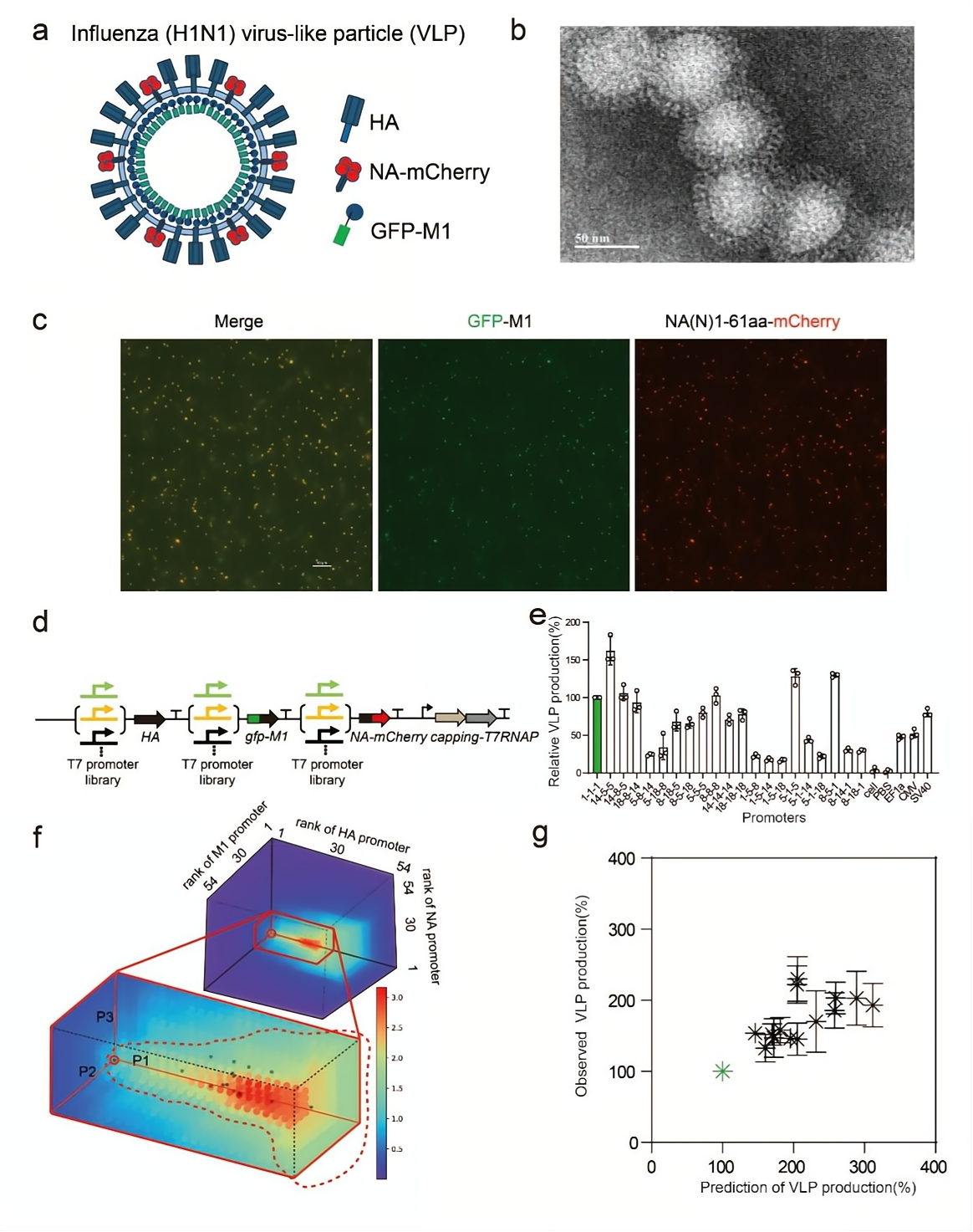 该工作通过在哺乳动物构建人工正交转录系统,实现了单个和多个启动子转录活性的精准微调,构建了具有预测能力的多基因表达量的定量热力学模型,并将这个定量模型应用于甲型流感病毒(H1N1)病毒样颗粒(VLP)组分与产量的优化设计。