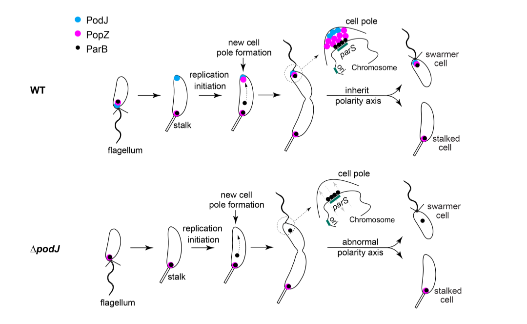 该研究发现脚手架蛋白PodJ通过蛋白-蛋白相互作用调控了PopZ的亚细胞定位,其相互作用决定了PopZ在细胞新极的出现时间。抑制PodJ-PopZ的相互作用将引发由PopZ介导的染色体分离出现异常,进而造成细胞周期中染色体分离与细胞分裂的解偶联。