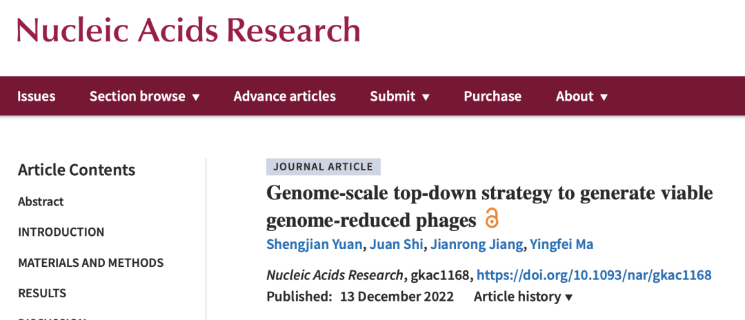 北京时间12月14日,中国科学院深圳先进技术研究院马迎飞团队在国际学术期刊《核酸研究》(Nucleic Acids Research,IF=19))上发表了题为Genome-scale top-down strategy to generate viable genome-reduced phages的文章。该工作报道了一种高通量制备底盘噬菌体的方法,在鉴定噬菌体非...