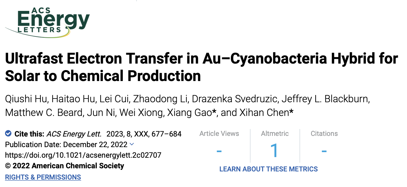 ACS Energy Letters | 眼见为实:瞬态光谱观察光生电子在金纳米颗粒-蓝细菌杂合体的界面传递