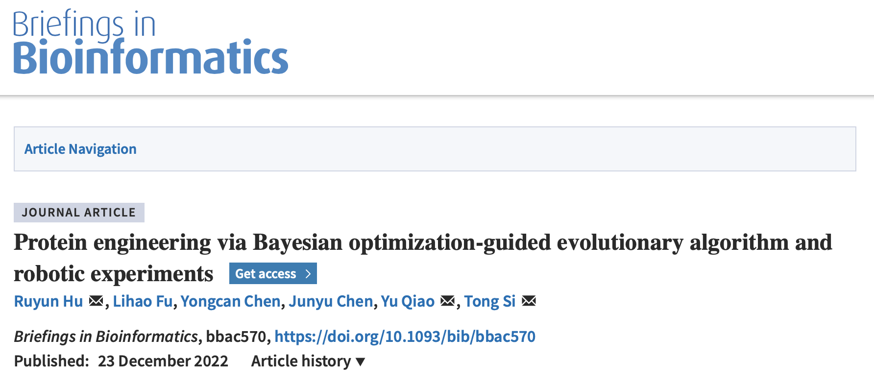 北京时间12月24日,中国科学院深圳先进技术研究院司同课题组和乔宇课题组合作,在生物信息期刊Briefings in Bioinformatics (IF: 13.994) 在线发表研究论文 “Protein engineering via Bayesian optimization-guided evolutionary algorithm and robotic experiments” 。本研究依托深...
