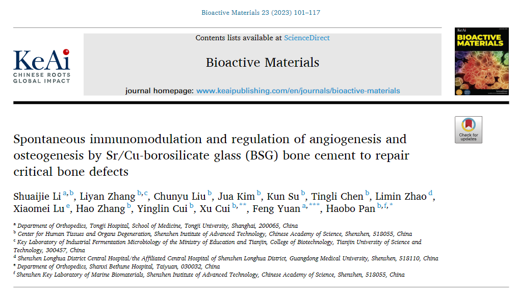 近期,中国科学院深圳先进技术研究院医药所人体组织与器官退行性研究中心潘浩波团队制备了一种具有调控免疫,成血管和成骨功能的可注射骨水泥,相关研究以“Spontaneous immunomodulation and regulation of angiogenesis and osteogenesis by Sr/Cu-borosilicate glass (BSG) bone cemen...
