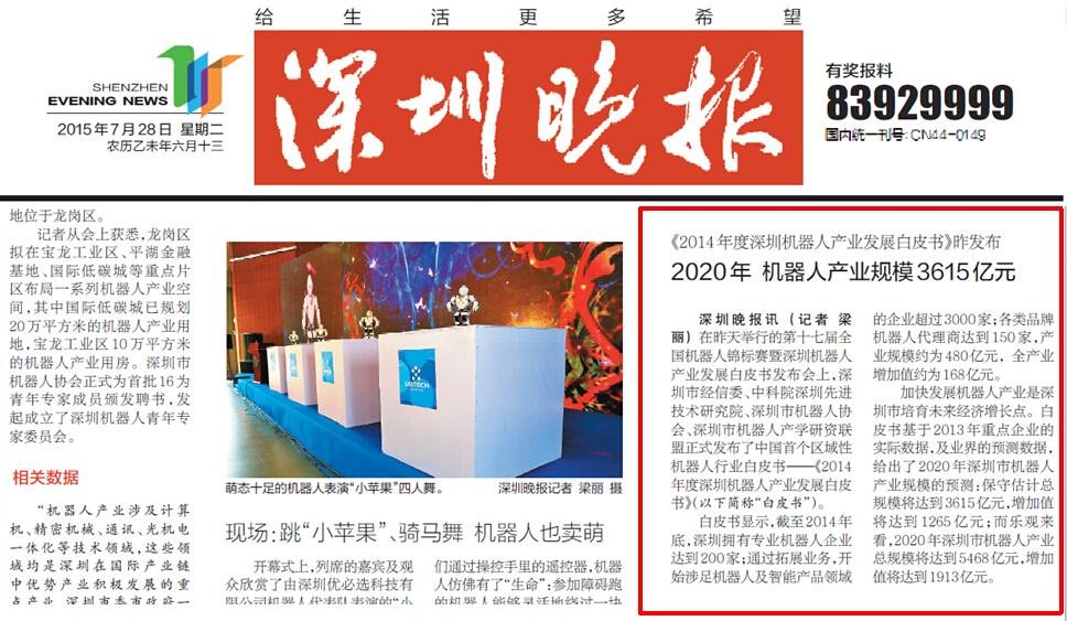 《深圳晚报》:《2014年度深圳机器人产业发展白皮书》昨发布
