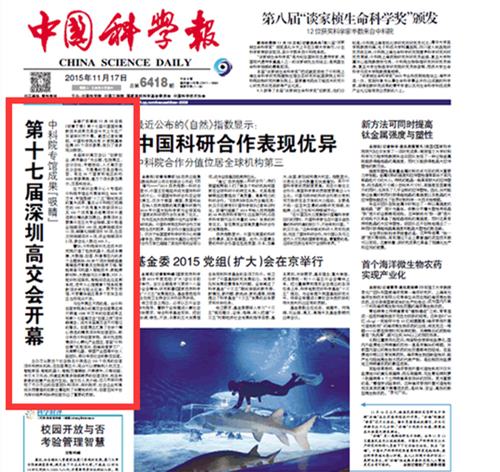 《中国科学报》头版:第十七届深圳高交会开幕中科院专馆成果“吸睛”
