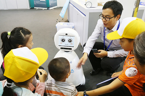 展馆现场最吸引小观众们的莫过于智能高端的机器人。这款具备3D视觉功能名为“哈哈”的萌物,它能看到物体的三维数据,有监护儿童,看护宠物之用;再看“迅翼”工业机器人,其驱动和传动系统完美搭配,极大地提高了分拣、装箱、搬运的速度,可用于物流行业;“未来天使”的语言风格极为调皮可爱,且具有萌娃天籁般的声音,能与人进行语音智能沟通……