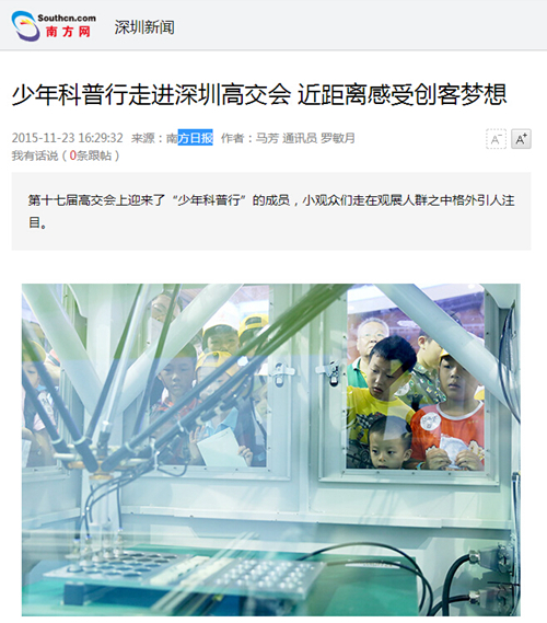 南方网:少年科普行走进深圳高交会 近距离感受创客梦想