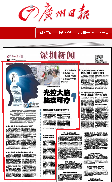 《广州日报》:最前沿脑科学技术亮相高交会 深圳联合香港打造国际脑科学创新研究院光控大脑 脑疾可疗