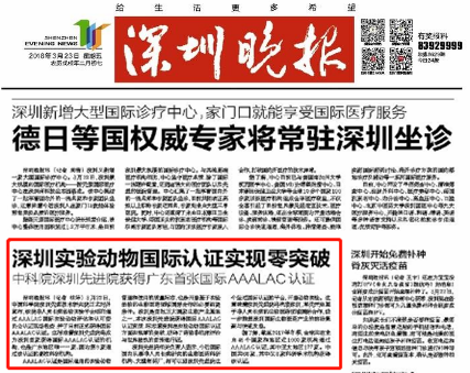 《深圳晚报》:深圳实验动物国际认证实现零突破中科院深圳先进院获得广东首张国际AAALAC认证