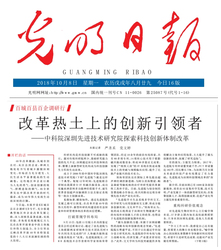 《光明日报》:改革热土上的创新引领者——中科院深圳先进技术研究院探索科技创新体制改革