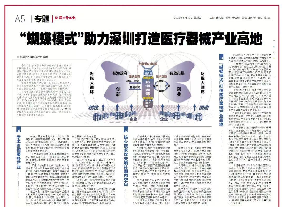 作为深圳高端医疗器械创新发展的“国家队”、主力军,中国科学院深圳先进技术研究院与依托深圳先进院深厚发展基础而筹建的深圳理工大学(简称“深理工”)(以下合称SIAT),通过16年的探索,聚焦创新链与产业链深度融合的时代要求,坚持科学与产业一体设计、一体推进,跨界整合,融通重构,构建具有医疗器械领域特色“0-1-10-∞”的“蝴蝶模式”,助力深圳打造国内领先、国际一流的高端医疗器械产业集聚发展高地。
