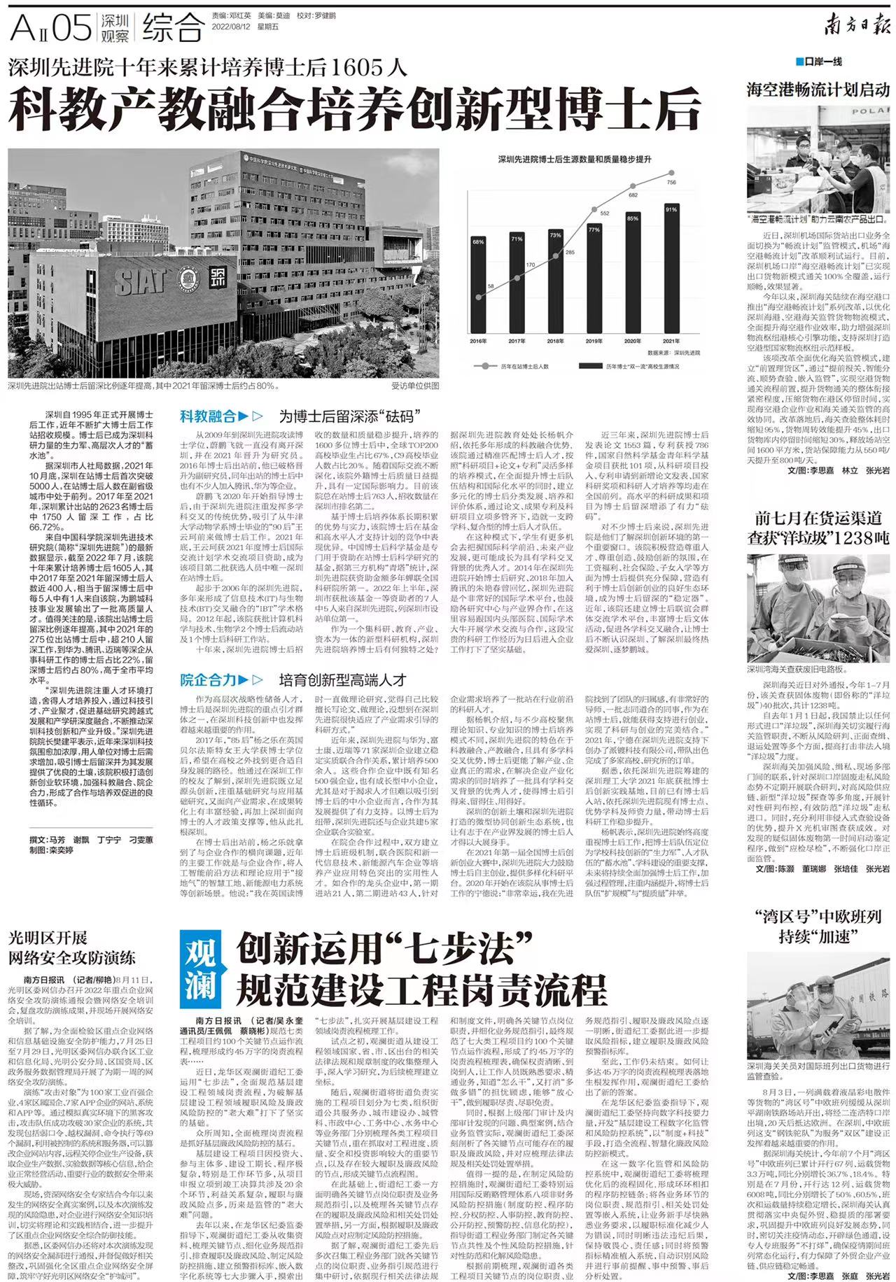 8月12日,《南方日报》就深圳先进院加强科教融合、院企合力,积极推进博士后工作进行了报道。