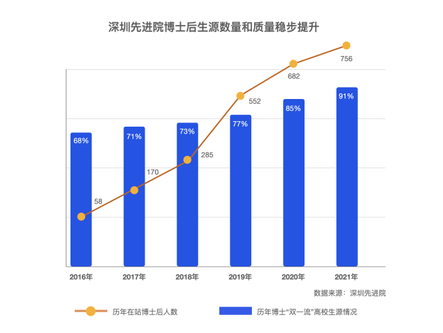 来自中国科学院深圳先进技术研究院(简称“深圳先进院”)的最新数据显示,截至2022年7月,该院十年来累计培养博士后1605人,其中2017年至2021年留深博士后人数近400人,相当于留深博士后中每5人中有1人来自该院,为鹏城科技事业发展输出了一批高质量人才。值得关注的是,该院出站博士后留深比例逐年提高,其中2021年的275位出站博士后中,超210人留深工作,到华为、腾讯、迈瑞等深企从事科研工作的博士后占比22%,留深博士后约占80%,高于全市平均水平。