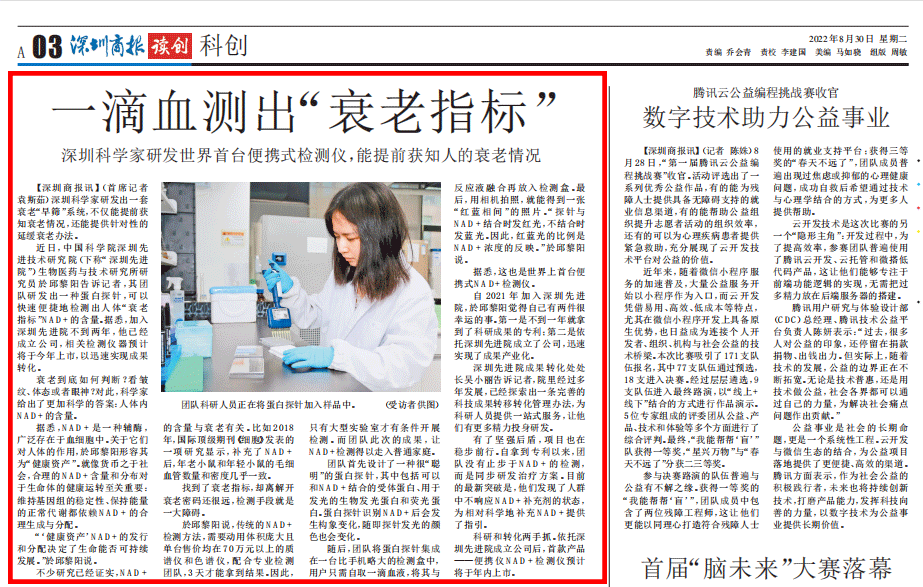 科研和转化两手抓。依托深圳先进院成立公司后,首款产品——便携仪NAD+检测仪预计将于年内上市。