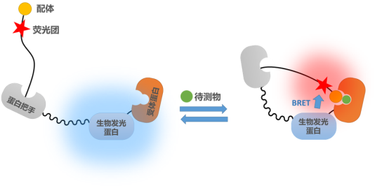 团队首先设计了一种很“聪明”的蛋白探针,其中包括可以和NAD+结合的受体蛋白、用于发光的生物发光蛋白和荧光蛋白。蛋白探针识别NAD+后会发生构象变化,随即探针发光的颜色也会变化。