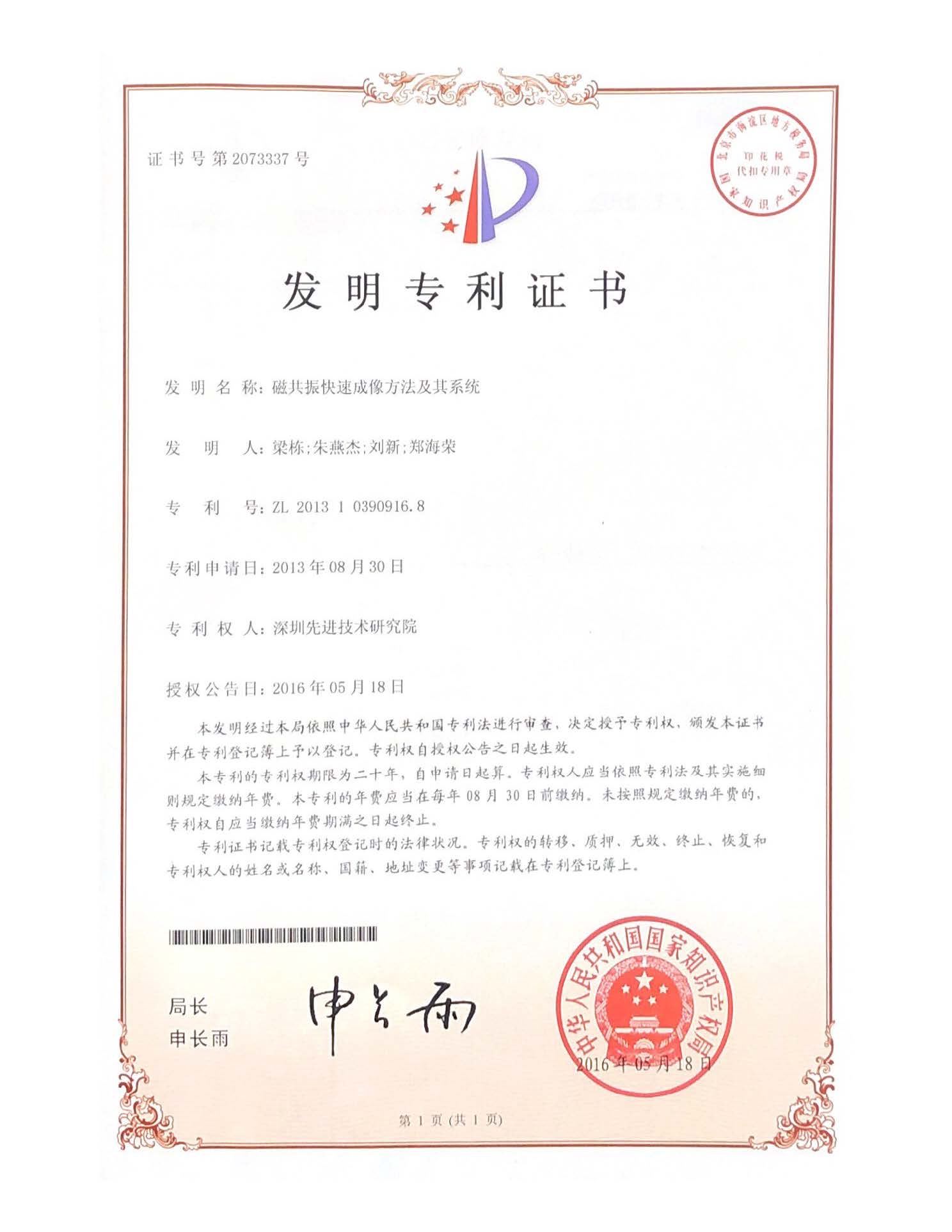 12月25日,由国家知识产权局和世界知识产权组织(WIPO)共同主办的第二十届中国专利奖颁奖大会在京举行。中国科学院深圳先进技术研究院的中国发明专利“磁共振快速成像方法及其系统”(专利号:ZL201310390916.8,发明人:梁栋、朱燕杰、刘新、郑海荣)获得了中国专利优秀奖。