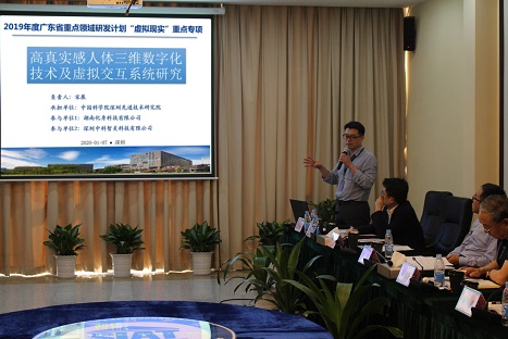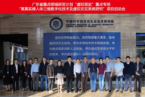 1月7日下午,广东省重点领域研发计划“虚拟现实”重点专项——“高真实感人体三维数字化技术及虚拟交互系统研究”项目启动会在中国科学院深圳先进技术研究院召开。广东省科学技术情报研究所副所长张百尚,中国科学院广州分院业务主管夏建军, 深圳市科技创新委员会信息处科长莫鸣,深圳先进院副院长吕建成、数字所所长乔宇,项目咨询专家北京工业大学王大勇教授、北京邮电大学桑新柱教授、深圳大学黄惠教授、深圳国泰安教育技术有限公司执行副总裁丁艳博士以及项目组成员出席会议,会议由深圳先进院科研处处长助理谢泽鑫主持。