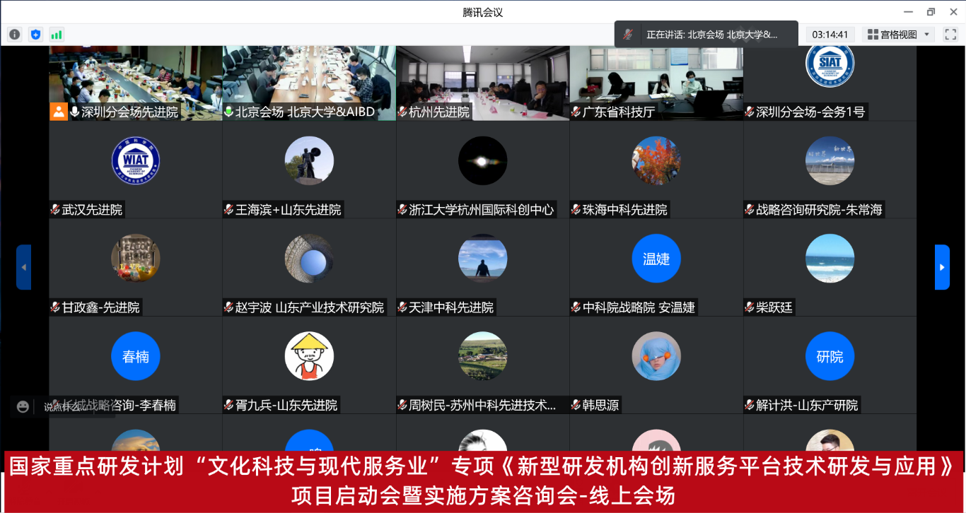 4月15日下午,2021年度国家重点研发计划“文化科技与现代服务业”专项—“新型研发机构创新服务平台技术研发与应用”项目启动会暨实施方案咨询会顺利召开。会议采用线上、线下相结合的方式,其中线下设置中国科学院深圳先进技术研究院、北京大数据先进技术研究院两个主要会场,其他各地单位线上参会。清华大学教授柴跃廷、北京大学教授王国成、深圳清华大学研究院副院长刘岩、中科院空天信息创新研究院研究员方震、北京量子研究院研究员常凯共计五位项目咨询专家,以及来自科技部高技术研究发展中心、科技部政策法规与创新体系建设司、科技部火炬中心、广东省科技厅产学研结合处的有关领导和各项目牵头单位、参与单位、外溢机构的单位代表共计100余人出席了会议。会议由深圳先进院数字所所长李烨主持。