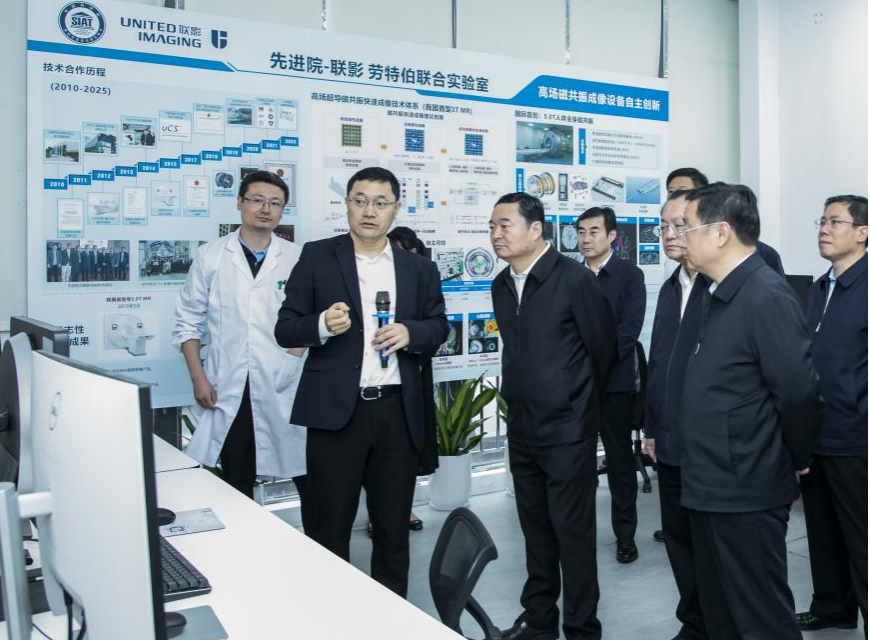 随后,代表团一行实地参观了深圳先进院展厅及深圳先进院医学成像科学与技术系统重点实验室,在展厅和实验室详细了解深圳先进院在医疗设备与科学仪器、生命健康与合成生物、先进电子与能源材料等关键技术上取得的科研进展。