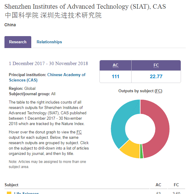 日前,自然指数网站公布了最新的自然指数排名。据最新数据显示(统计时间范围为2017年12月1日至2018年11月30日),按照加权分数式计量(weighted fractional count/WFC)指数排名,中国科学院深圳先进技术研究院WFC指数为22.77,较去年提高了57.7%,在广东省科研机构中位列第二,在中国科...