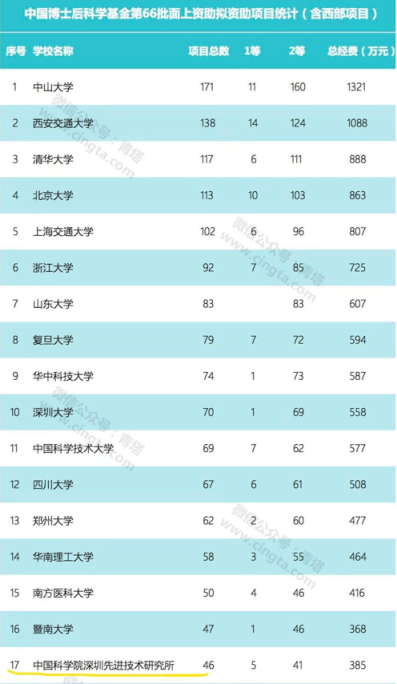 2019年11月8日,中国博士后科学基金会正式公布了第66批面上资助获选人员名单,中国科学院深圳先进技术研究院46名博士后获得资助,其中,5人获一等资助,41人获二等资助,资助总额共385万,获批基金通过率持续稳定。根据青塔数据统计,深圳先进院获批人数在整个中科院院所中蝉联三年排名第1,获批人数位列全国高校科研院所第17名。