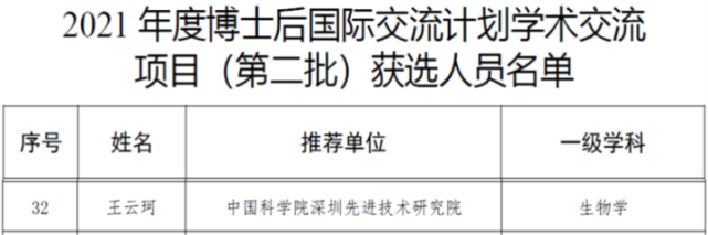 深圳先进院博士后王云珂获2021年度博士后国际交流计划学术交流项目资助