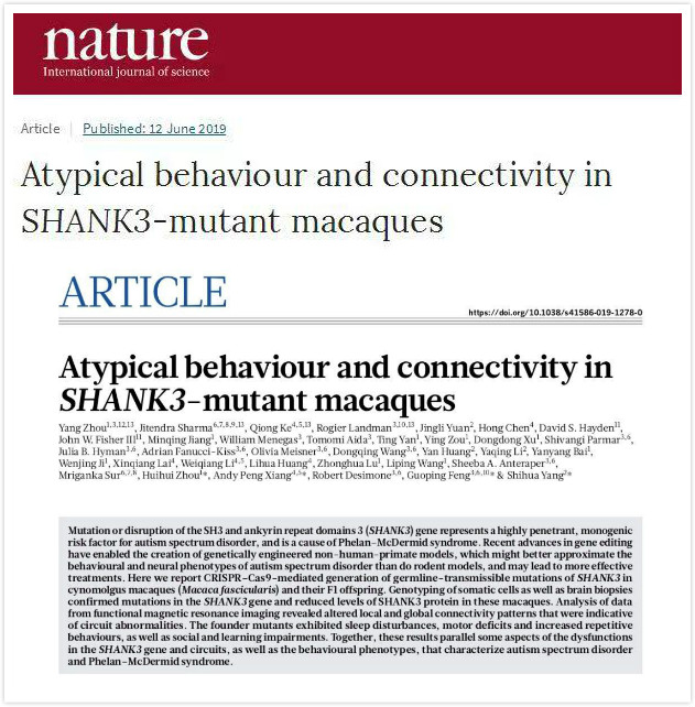 自闭症是我国儿童精神类第一大疾病,表现为社交障碍、刻板行为等。自闭症人群难以融入社会,给家庭带来沉重的压力,越来越得到社会各界的关注。2019年6月,中国科学院深圳先进技术研究院脑认知与脑疾病研究所副所长周晖晖研究员与国内及国际团队联合攻关,成功建立了新型模拟人类自闭症的SHANK3基因突变非人灵长类动物模型。