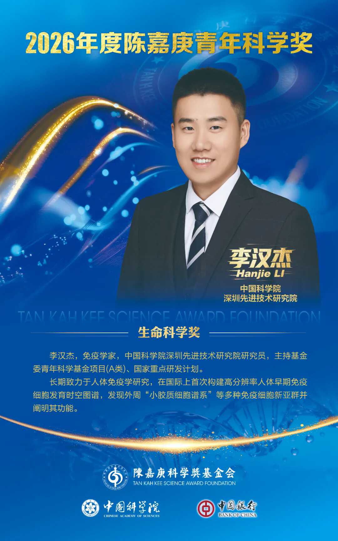 中国科学院深圳先进技术研究院李汉杰研究员凭借在免疫学领域取得的原创性重大突破,荣获本年度陈嘉庚青年科学奖(生命科学奖)。该奖项旨在表彰40岁以下在基础科学领域做出杰出贡献的中国青年科技人才,每两年评选一次,是我国重要的青年科技荣誉。
