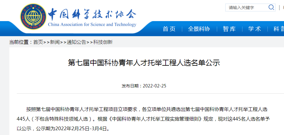 2月25日,中国科学技术协会发布《第七届中国科协青年人才托举工程人选名单公示》。按照第七届中国科协青年人才托举工程项目立项要求,各立项单位共遴选出第七届中国科协青年人才托举工程人选445人(不包含特殊科技领域人选)。其中,中国科学院深圳先进技术研究院材料所材料界面研究中心...