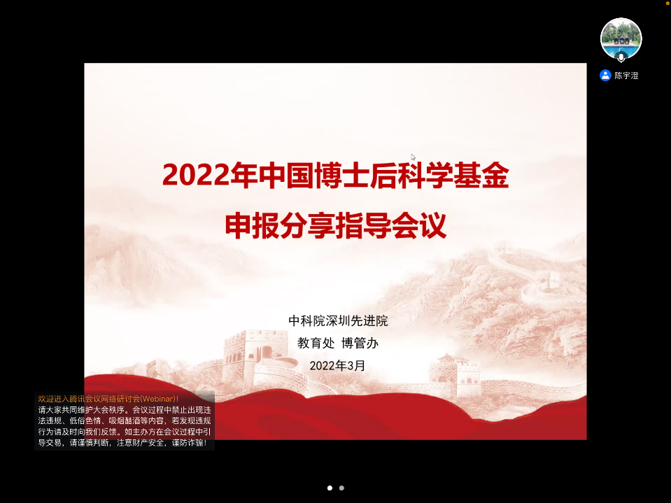 近日, 2022年中国博士后科学基金申报分享指导会顺利在线上举办,共吸引了150余博士后参会。会上,中国科学院深圳先进技术研究院教育处陈宇澄老师介绍了博士后科学基金的申报流程。同时,邀请了我院四位优秀的博士后科学基金获得者代表——来自材料所界面研究中心的段尊斌、集成所神经工...