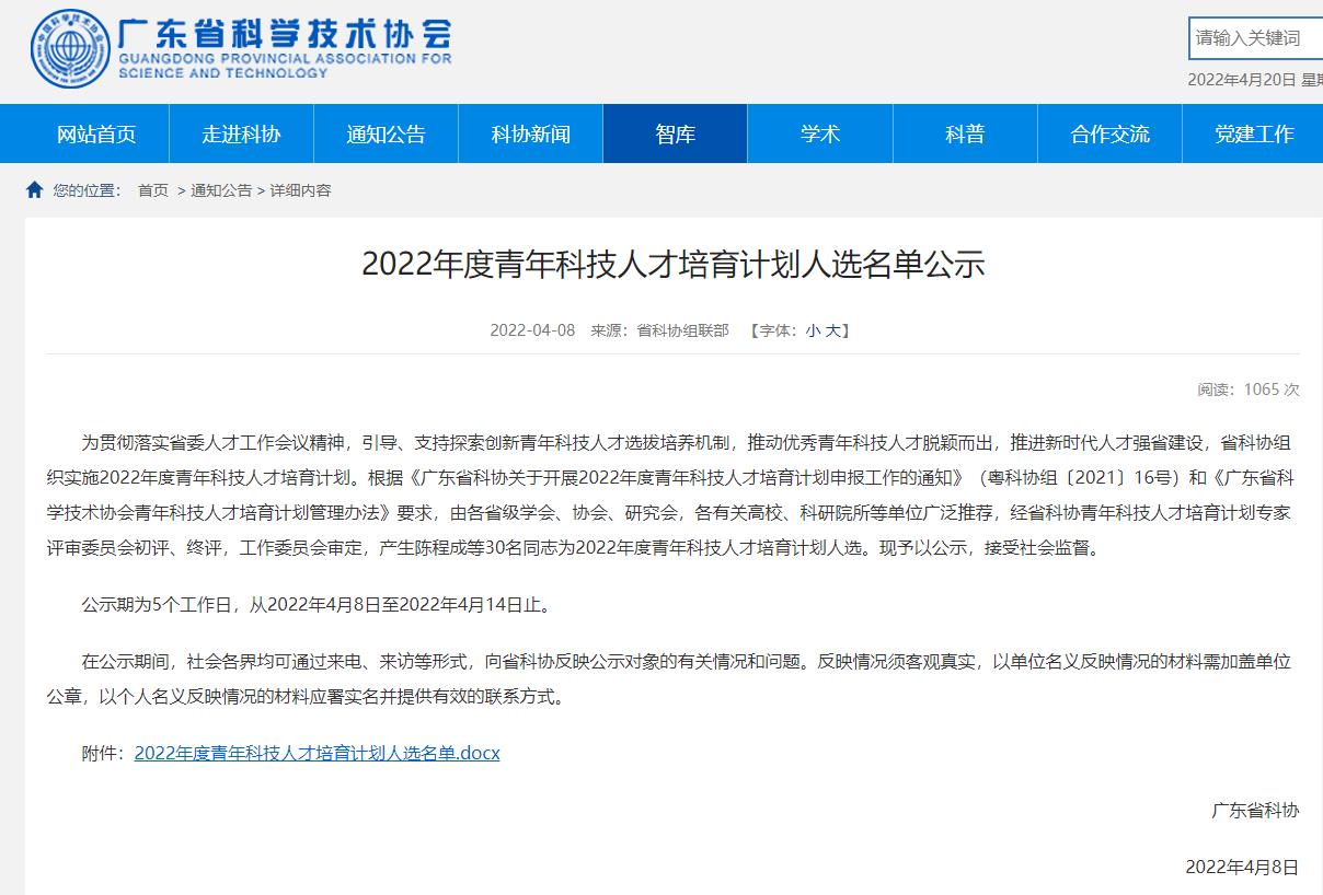 近日,广东省科协发布了2022年度青年科技人才培育计划入选名单公示通知,经省科协青年科技人才培育计划专家评审委员会初评、终评,工作委员会审定,产生30名同志为2022年度青年科技人才培育计划人选,中国科学院深圳先进技术研究院医工所微创中心梁晓坤同志成功入选,指导老师为谢耀钦研...