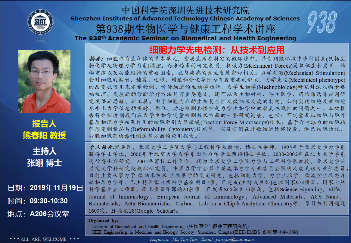 大家好!医工所将于2019年11月19日(周二)上午09:30-10:30,在 A206会议室 举办第938期生物医学与健康工程学术讲座,特邀 北京大学 熊春阳教授 作题为“细胞力学光电检测:从技术到应用”的学术报告。诚挚邀请大家参加学习和交流!