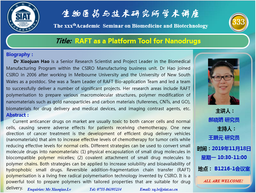 医药所第333期学术讲座将于2019年11月18日星期一10:30-11:00在先进院B1216-1会议室举行。本次讲座邀请了郝晓娟研究员,带来“RAFT as a Platform Tool for Nanodrugs”的报告。届时,王鹏元研究员将主持讲座。诚挚邀请大家准时参加、学习和交流!