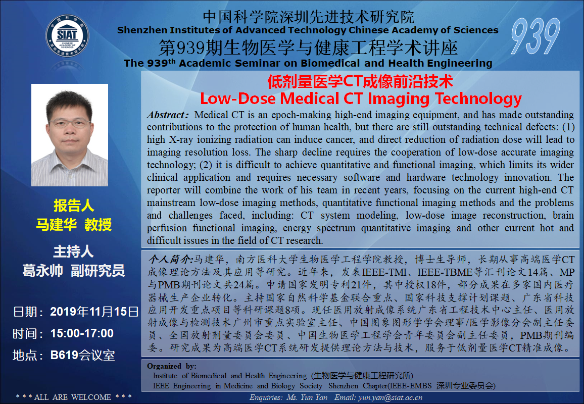 大家好!医工所将于2019年11月15日(周五)下午15:00-17:00,在 B619会议室 举办第939期生物医学与健康工程学术讲座,特邀 南方医科大学 马建华教授 作题为“低剂量医学CT成像前沿技术”的学术报告。诚挚邀请大家参加学习和交流!