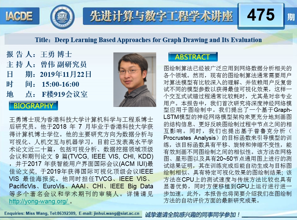 大家好!先进计算与数字工程学术讲座第475期将于11月22日 15:00-16:00在F栋919会议室举行,本次讲座将邀请香港科技大学 王勇 博士作题为“Deep Learning Based Approaches for Graph Drawing and Its Evaluation”的报告。本次报告将由数字所曾伟 副研究员主持,诚挚邀请大家参加、学习和交流!