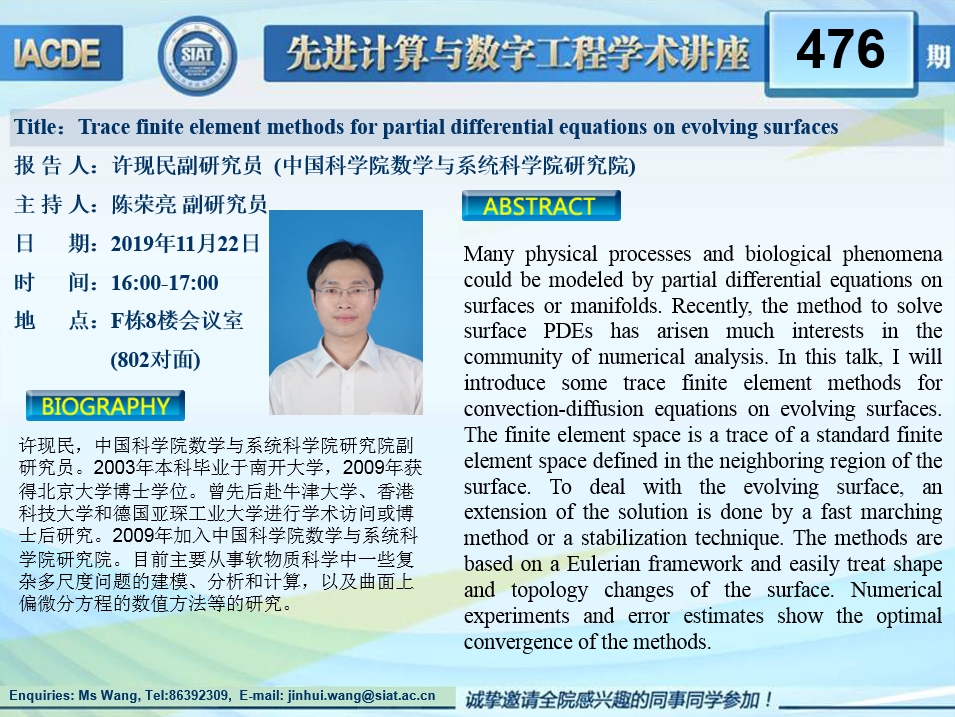 大家好!先进计算与数字工程学术讲座第476期将于11月22日 16:00-17:00在F栋8楼会议室(802对面)举行,本次讲座将邀请中国科学院数学与系统科学院研究院 许现民 副研究员作题为“Trace finite element methods for partial differential equations on evolving surfaces”的报告。本次报告将由数字所陈荣亮 副研究员主持,诚挚邀请大家参加、学习和交流!