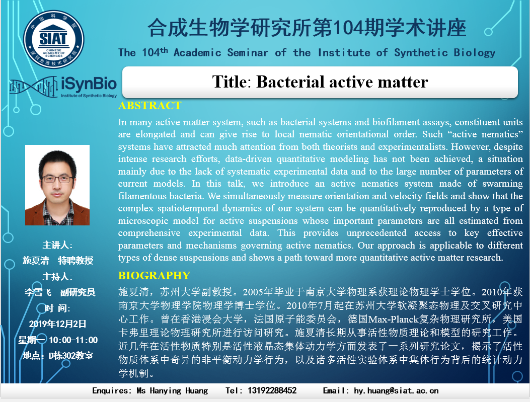 本次讲座邀请了苏州大学 施夏清 特聘教授 带来“Bacterial active matter”的报告。