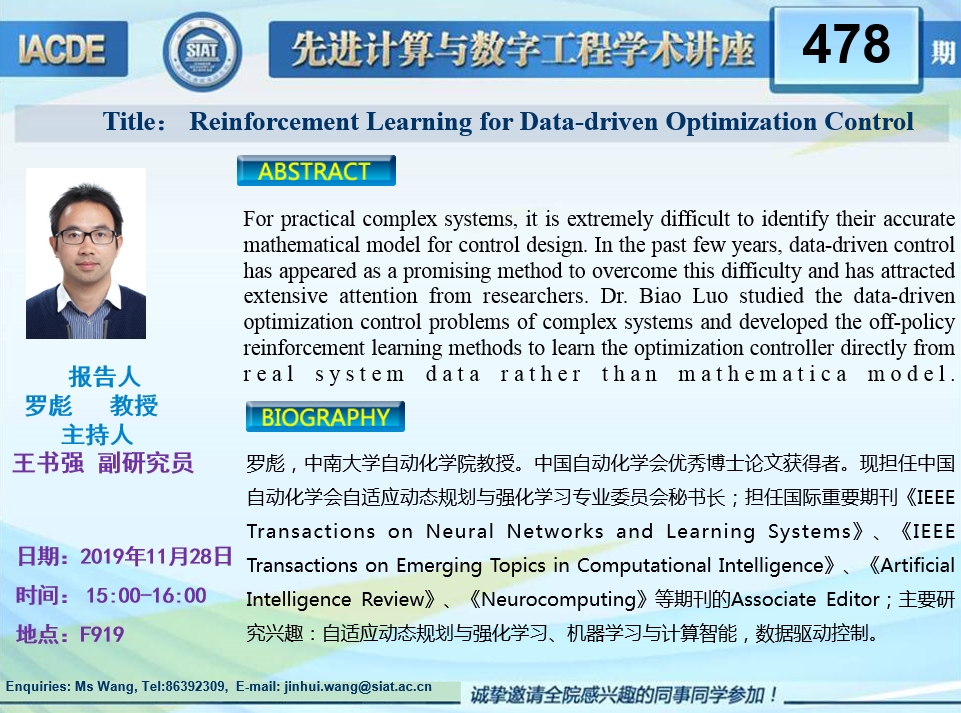 大家好!先进计算与数字工程学术讲座第478期将于11月28日 15:00-16:00在F栋919会议室举行,本次讲座将邀请中南大学自动化学院 罗彪 教授作题为“Reinforcement Learning for Data-driven Optimization Control”的报告。本次报告将由数字所王书强 副研究员主持,诚挚邀请大家参加、学习和交流!