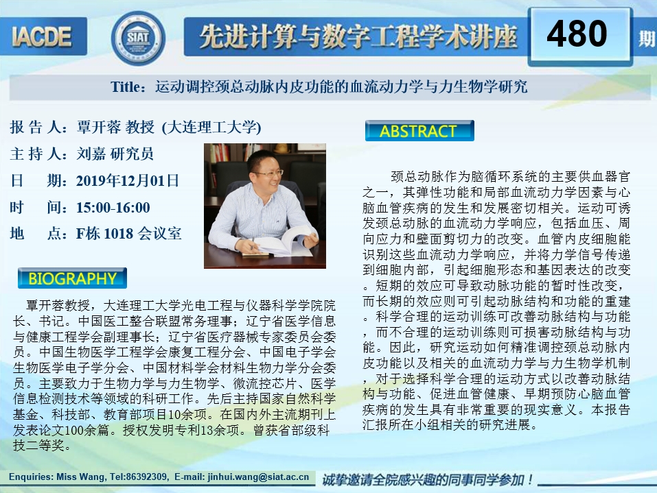 大家好!先进计算与数字工程学术讲座第480期将于12月1日 15:00-16:00在F栋1018会议室举行,本次讲座将邀请大连理工大学 覃开蓉 教授作题为“运动调控颈总动脉内皮功能的血流动力学与力生物学研究”的报告。本次报告将由数字所刘嘉 研究员主持,诚挚邀请大家参加、学习和交流!