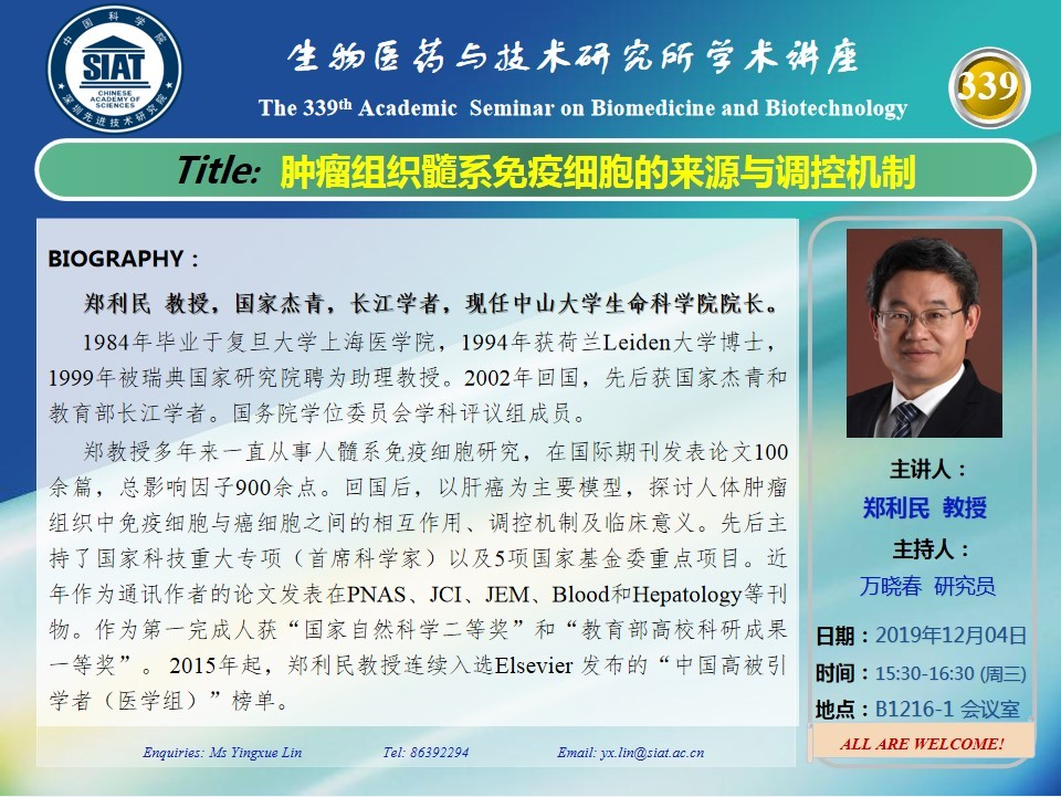 医药所第339期学术讲座将于2019年12月4日星期三15:30-16:30在先进院B1216-1会议室举行。本次讲座邀请了郑利民教授,带来“ 肿瘤组织髓系免疫细胞的来源与调控机制”的报告。届时,万晓春研究员将主持讲座。诚挚邀请大家准时参加、学习和交流!