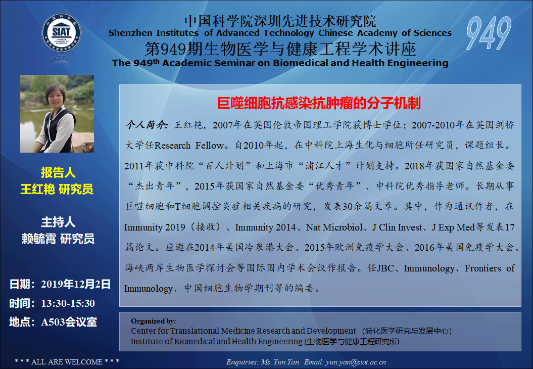 大家好!医工所将于2019年12月2日(周一)下午13:30-15:30,在 A503会议室 举办第949期生物医学与健康工程学术讲座,特邀 中科院上海生化与细胞所 王红艳 研究员 作题为“巨噬细胞抗感染抗肿瘤的分子机制”的学术报告。诚挚邀请大家参加学习和交流!
