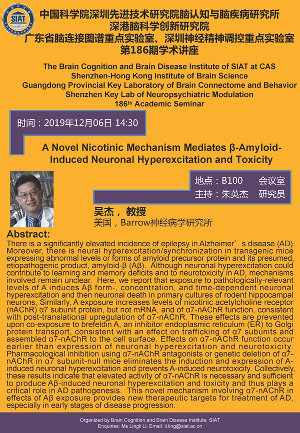 大家好!脑认知与脑疾病研究所将于2019年12月06日14:30,在B100会议室举办第一百八十六期学术讲座,本次讲座由美国,Barrow神经病学研究所,吴杰教授做题为“ A Novel Nicotinic Mechanism Mediates β-Amyloid-Induced Neuronal Hyperexcitation and Toxicity ”的专题报告。