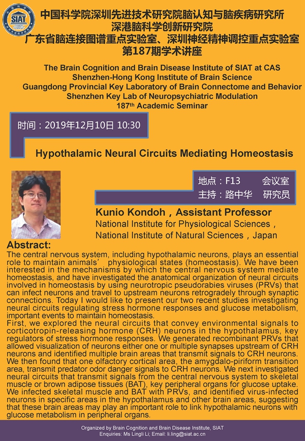 大家好!脑认知与脑疾病研究所将于2019年12月10日10:30,在F13会议室举办第一百八十七期学术讲座,本次讲座由日本国立生理学研究所,Kunio Kondoh博士做题为“ Hypothalamic Neural Circuits Mediating Homeostasis ”的专题报告。