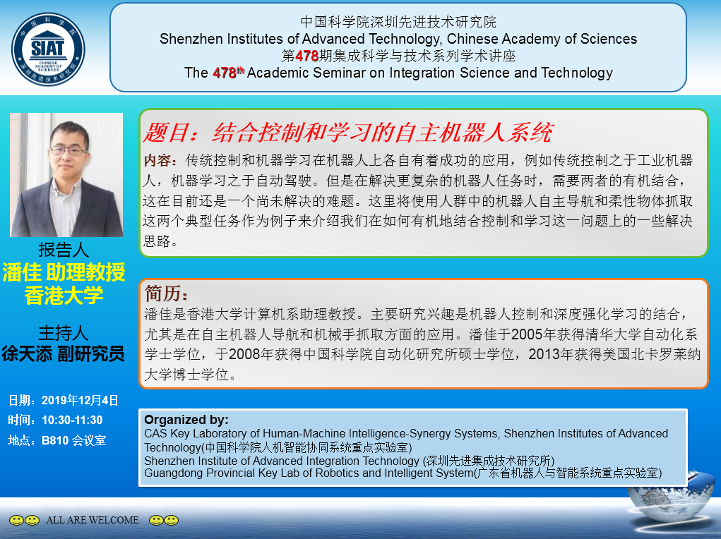 集成所第478期集成科学与技术系列学术讲座将于12月4日(周三)上午10:30~11:30在B810会议室召开。本次讲座特邀香港大学的潘佳助理教授作题为《结合控制和学习的自主机器人系统》的学术报告。