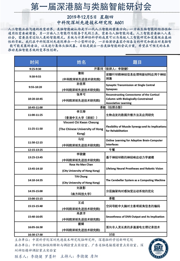 【2019年12月05日 脑所】第一届深港脑与类脑智能研讨会