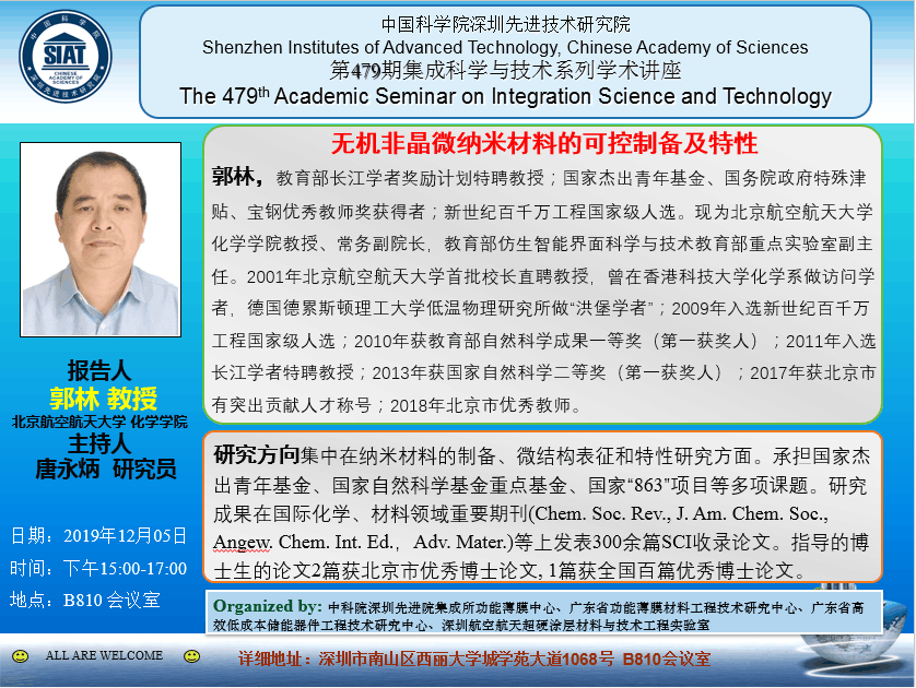 集成所第479期集成科学与技术系列学术讲座将于12月5日(周四)下午15:00~17:00在B810会议室召开。本次讲座特邀北京航空航天大学的郭林教授作题为《无机非晶微纳米材料的可控制备及特性》的学术报告。