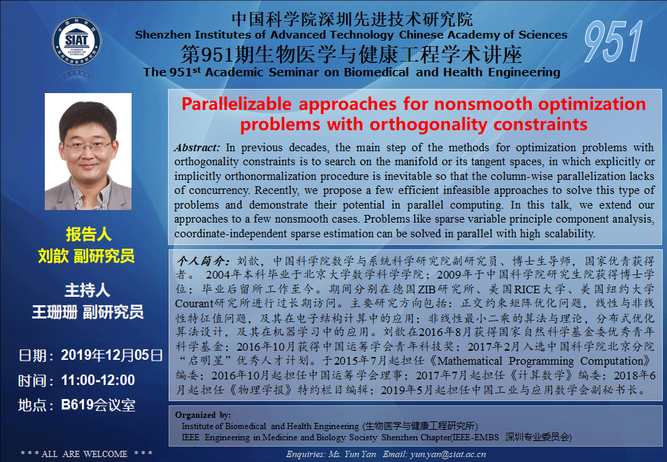 大家好!医工所将于2019年12月5日(周四)上午11:00-12:00,在 B619会议室 举办第951期生物医学与健康工程学术讲座,特邀 中国科学院数学与系统科学研究院 刘歆 副研究员 作题为“Parallelizable approaches for nonsmooth optimization problems with orthogonality constraints”的学术报告。诚挚邀请大家参加学习和交流!