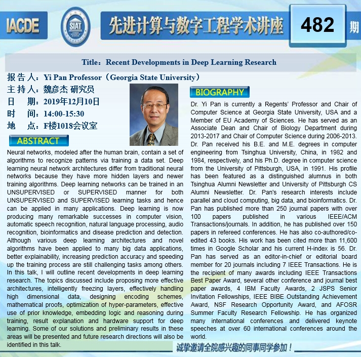 大家好!先进计算与数字工程学术讲座第482期将于12月10日 14:00-15:30在F栋1018会议室举行,本次讲座将邀请美国佐治亚州立大学 Yi Pan 教授作题为“Recent Developments in Deep Learning Research”的报告。本次报告将由数字所魏彦杰 研究员主持,诚挚邀请大家参加、学习和交流!