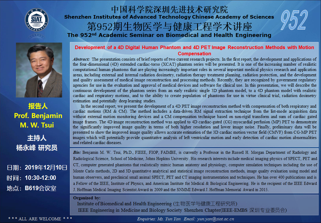 大家好!医工所将于2019年12月10日(周二)上午10:30-12:00,在 B619会议室 举办第952期生物医学与健康工程学术讲座,特邀 Johns Hopkins University Prof. Benjamin M. W. Tsui 作题为“Development of a 4D Digital Human Phantom and 4D PET Image Reconstruction Methods with Motion Compensation”的学术报告。诚挚邀请大家参加学习和交流!
